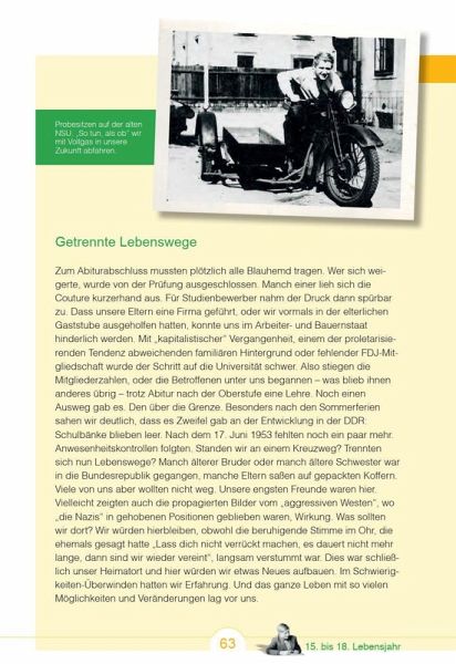 Aufgeregt und erwartungsvoll, so blickten wir damals in die Zukunft! Erinnern Sie sich mit uns an die ersten 18 Lebensjahre an Ihre Kindheit und Jugend! Jahrgang 1935 das sind wir als Kinder in Leibchen und Lederhosen, mit Murmelsack oder Tretroller im Deutschen Reich, das sich rüstet für einen Krieg. Zur Schulzeit gehören Fibel und Rohrstock genauso wie Luftschutzkeller, Sirenengeheul und ein stetig knurrender Magen. Der Friede bringt Neulehrer, Einquartierungen und manchen Vater zurück. In der sowjetisch besetzten Zone wachsen wir zwischen Trümmern hinein in unsere Jugend, wie in den neuen Staat DDR mit beginnender Kollektivierung und den ersten Blauhemden.