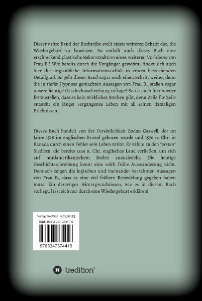 Dieser dritte Band der Buchreihe stellt einen weiteren Schritt dar, die Wiedergeburt zu beweisen. So enthält auch dieses Buch eine erschreckend plastische Rekonstruktion eines weiteren Vorlebens von Frau B.! Wie bereits durch die Vorgänger gewohnt, findet sich auch hier die unglaubliche Informationsvielfalt in einem bestechenden Detailgrad. So geht dieser Band sogar noch einen Schritt weiter, denn die in tiefer Hypnose gemachten Aussagen von Frau B., stellen sogar unsere heutige Geschichtsschreibung infrage! So ist auch hier wieder festzustellen, dass es kein wirkliches Sterben gibt, denn Zeile für Zeile entsteht ein längst vergangenes Leben mit all seinen damaligen Erlebnissen. Dieses Buch handelt von der Persönlichkeit Bodan Caswell, der im Jahre 1518 im englischen Bristol geboren wurde und 1576 n. Chr. in Kanada durch einen Fehler sein Leben verlor. Er zählte zu den "ersten" Siedlern, die bereits 1524 n. Chr. englisches Land verließen, um sich auf nordamerikanischem Bodenanzusiedeln. Die heutige Geschichtsschreibung kennt eine solch frühe Auswanderung nicht. Dennoch zeigen die logischen und ineinander verzahnten Aussagen von Frau B., dass es eine viel frühere Besiedelung gegeben haben muss. Ein derartiges Hintergrundwissen, wie es in diesem Buch vorliegt, lässt sich nur durch eine Wiedergeburt erklären!