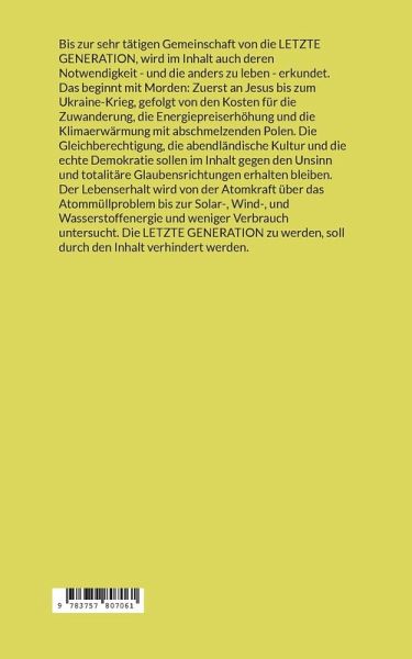 Bis zur sehr tätigen Gemeinschaft von die Letzte Generation, wird im Inhalt auch deren Notwendigkeit - und die anders zu leben - erkundet. Das beginnt mit Morden: Zuerst an Jesus bis zum Ukraine-Krieg, gefolgt von den Kosten für die Zuwanderung, die Energiepreiserhöhung und die Klimaerwärmung mit abschmelzenden Polen. Die Gleichberechtigung, die abendländische Kultur und die echte Demokratie sollen im Inhalt gegen den Unsinn und totalitäre Glaubensrichtungen erhalten bleiben. Der Lebenserhalt wird von der Atomkraft über das Atommüllproblem bis zur Solar-, Wind-, und Wasserstoffenergie und weniger Verbrauch untersucht. Die Letzte Generation zu werden, soll durch den Inhalt verhindert werden.