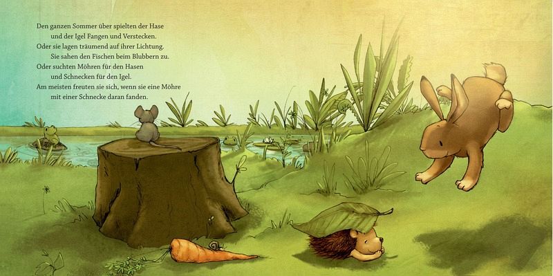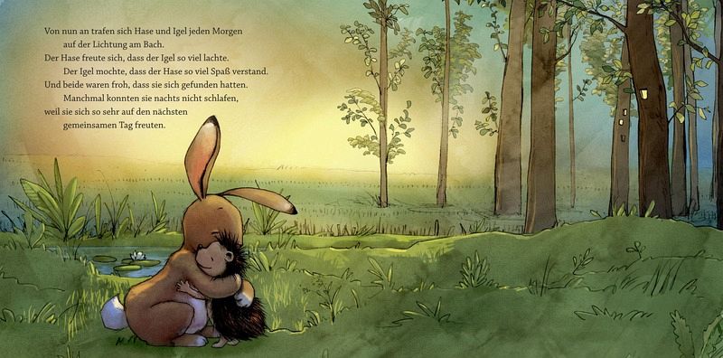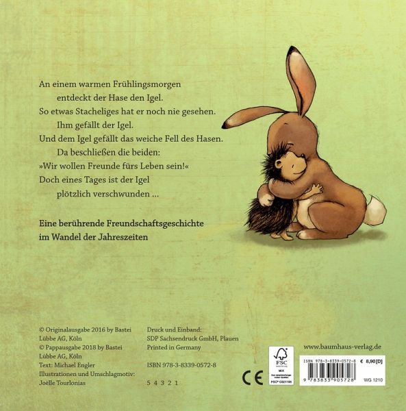 An einem warmen Frühlingsmorgen entdeckt der Hase den Igel. So etwas Stacheliges hat er noch nie gesehen. Ihm gefällt der Igel. Und dem Igel gefällt das weiche Fell des Hasen. Von nun an treffen sich die beiden jeden Morgen auf der Lichtung am Bach, spielen Fangen und Verstecken und beschließen: »Wir wollen Freunde fürs Leben sein!« Doch eines Tages ist der Igel plötzlich verschwunden ...Eine berührende Freundschaftsgeschichte im Wandel der Jahreszeiten nun auch als Pappbilderbuch