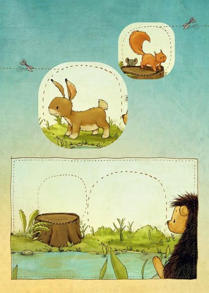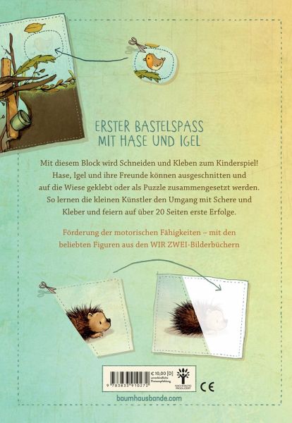 So müssen wir auf dem ersten Blatt kleine Bilder von Hase und Igel ausschneiden um sie dann auf ein Bild, auf dem eine Möhre auf einer Wiese liegt, aufkleben. Auf der zweiten Seite wird es noch einfacher, hier ist ein Bild vom Igel einmal zerteilt und muss vertauscht auf der Vorlage zusammengefügt werden. Die auszuschneidenden Stücke sind für ein Dreijähriges-Kind leicht auszuschneiden, da sie eine einfache Form haben. So geht es auf 22 Blättern weiter. Immer sind die niedlichen Zwei und ihre Freunde zu sehen. Vielleicht mögen sich die Kinder zu den Bildern Geschichten einfallen lassen?