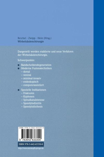 Bandscheibendegeneration.- 1 Klinische und bildgebende Diagnostik des lumbalen Bandscheibenvorfalls.- 2 Lumbaler Bandscheibenvorfall - Konservative oder operative Behandlung?.- 3 Prinzipien der konservativen Behandlung des Bandscheibenvorfalls.- 4 Prinzipien der operativen Behandlung des lumbalen Bandscheibenvorfalls.- 5 Langzeitergebnisse nach konventioneller lumbaler Diskotomie.- 6 Die lumbale Mikrodiskotomie - Indikation, operatives Procedere.- 7 Die Bandscheibenoperation im Lumbaibereich Ergebnisse einer klinischen Nachuntersuchung der perkutanen Laser-Diskusdekompression und der mikrochirurgischen Bandscheibenoperation.- 8 ALPD oder PN - die perkutane Nucleotomie nach Gary Onik Behandlungsergebnisse von 1987-.- 9 Postdiskotomie-Syndrom - Diagnostische Kriterien, morphologisches Korrelat, Therapieansätze.- 10 Künstliche Bandscheibenimplantate im Bereich der lumbalen Wirbelsäule.- Stabilisierungstechniken der Wirbelsäule.- 11 Dorsale Stabilisierungen.- 12 Ventrale Instrumentationen.- 13 Intervertebrale Fusionen mit Cages.- 14 Endoskopische Zugänge zur Brustwirbelsäule.- 15 Mikrochirurgische ventrale Fusionstechniken an der Lendenwirbelsäule.- 16 Computerassistierte Wirbelsäulenchirurgie.- 17 Wirbelsäulenoperationen im offenen.- Spezielle Indikationen.- 18 Frakturstabilisierung im HWS-Bereich.- 19 Traumatologie der thorakolumbalen Wirbelsäule.- 20 Die lumbale Spinalkanalstenose.- 21 Möglichkeiten der operativen Behandlung kyphotischer Deformitäten der Brust- und Lendenwirbelsäule.- 22 Operative Therapie der thorakolumbalen Spondylodiscitis.- 23 Spondylolisthesis: Reposition und Fusion durch Posterior-only approach.