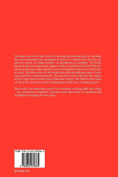 Aus den Rezensionen: "Das Buch ... enthält eine englische Fassung der ersten Hälfte des Buches Drahtseile aus dem Jahre 2000, erweitert um neuere Erkenntnisse. Wie der Titel erkennen lässt, befasst sich das Buch hauptsächlich mit der Beanspruchung, der Lebensdauer und der Zuverlässigkeit der Drahtseile. Die Methoden zur Berechnung dieser Größen und ihre Entwicklung werden vorgestellt. Die Anwendung der Rechenmethoden wird durch zahlreiche Beispiele erläutert." (in: f+h - Fördern + Heben, 2007, Issue 11, S. 590) "... Die Bemessung der Seile nach den gültigen technischen Regeln für Aufzüge, Krane und Hebezeuge und nach der Lebensdauer ... wird beschrieben und an Beispielen aus der Praxis vertieft. ... Das Fachbuch erläutert die Grundlagen zum sicheren und zuverlässigen Betrieb von Seiltrieben und seilbetriebenen Anlagen und Maschinen und enthält wichtige Ergebnisse und Erkenntnisse aus der Drahtseilforschung. Für alle im internationalen Geschäft tätigen Anwender von Drahtseilen, für Konstrukteure, für Mitarbeiter im Vertrieb und für die Prüfer von Drahtseilen ist dieses Fachbuch eine wertvolle Hilfe." (Ernst-August Siekhans, in: Technische Überwachung, 2008, Vol. 49, Issue 1-2, S. 53) "... Mit dem ... Buch liegt die Zusammenfassung des bestehenden Wissens über das Drahtseil erstmals in englischer Sprache vor. Das Buch ist im Wesentlichen die Übersetzung der ersten drei Kapitel des Buches 'Drahtseile - Bemessung, Betrieb, Sicherheit' ... In diese Kapitel ist darüber hinaus der enorme Wissenszuwachs der letzten Jahre integriert worden." (in: Draht, 2008, Issue 4, S. 42)
