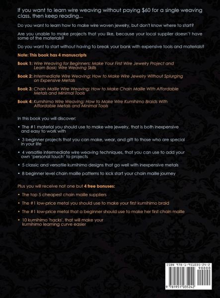 If you want to learn wire weaving without paying $60 for a single weaving class, then keep reading... Do you want to learn how to make wire woven jewelry, but don't know where to start? Do you want to learn at home, without having to pay $60 for attending a single wire weaving class? Are you unable to make projects that you like, because your local supplier doesn't have some of the materials? Do you want to start without having to break your bank with expensive tools and materials? As a wire weaver, I, the author, also faced such problems. That is why I came up with secret methods that make it easy for you to start wire weaving with just a few basic tools. I will share these secrets inside this book. Note: This book has 4 manuscripts Book 1: Wire Weaving for Beginners: Make Your First Wire Jewelry Project and Learn Basic Wire Weaving Skills Book 2: Intermediate Wire Weaving: How to Make Wire Jewelry Without Splurging on Expensive Metals Book 3: Chain Maille Wire Weaving: How to Make Chain Maille With Affordable Metals and Minimal Tools Book 4: Kumihimo Wire Weaving: How to Make Wire Kumihimo Braids With Affordable Metals and Minimal Tools In this book you will discover: The #1 material you should use to make wire jewelry, that is both inexpensive and easy to work with 3 beginner projects that you can make, wear, and gift to those who are special in your life 4 versatile intermediate wire weaving techniques, that you can use to add your own 'personal touch' to projects The secret tool you should use to measure the gauge of your wire, that has personally made it easier for the author herself 1 handy method to incorporate and show off colorful beads in your projects 1 simple 'hack' that will allow you to never purchase a clasp or earring wire ever again One major mistake that completely ruins expensive base wires in your projects, and how to solve it How to add cabochons to your kumihimo projects 5 classic and versatile kumihimo designs that go well with inexpensive metals How to get a patina finish on your kumihimo projects The biggest mistake you could be making when braiding wire 8 beginner level chain maille patterns to kick start your chain maille journey How to avoid wasting money while buying jump rings An easy way to eliminate ring math for chain maille Plus you will receive not one but 4 free bonuses: The top 5 cheapest chain maille suppliers The #1 low-price metal you should use to make your first kumihimo braid The #1 low-price metal that a beginner should use to make her first chain maille 10 kumihimo 'hacks', that will make your kumihimo learning curve easier But, as a complete beginner, will you be able to make wire jewelry using this book? Yes. This book has been designed to let the beginner pursue her hobby, without feeling like it's too complicated. From beginner projects to wire braids with lush blue cabochons, you will be able to learn a range of designs, even if you have never touched wire before. Note: 2 manuscripts in this book do not have pictures. The other 2 have black and white pictures only Take action now and buy this book!