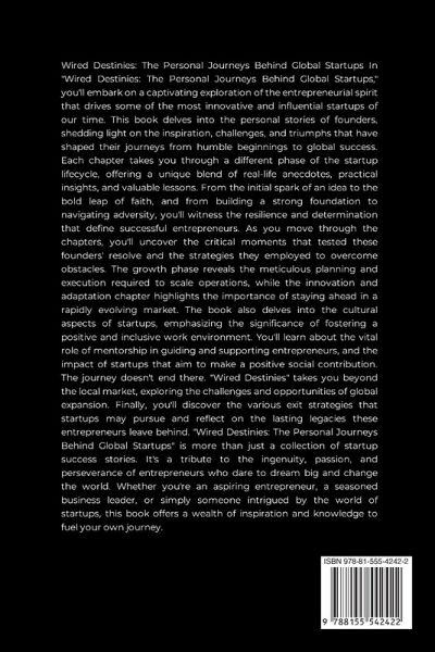 In "Wired Destinies: The Personal Journeys Behind Global Startups," you'll embark on a captivating exploration of the entrepreneurial spirit that drives some of the most innovative and influential startups of our time. This book delves into the personal stories of founders, shedding light on the inspiration, challenges, and triumphs that have shaped their journeys from humble beginnings to global success. Each chapter takes you through a different phase of the startup lifecycle, offering a unique blend of real-life anecdotes, practical insights, and valuable lessons. From the initial spark of an idea to the bold leap of faith, and from building a strong foundation to navigating adversity, you'll witness the resilience and determination that define successful entrepreneurs. As you move through the chapters, you'll uncover the critical moments that tested these founders' resolve and the strategies they employed to overcome obstacles. The growth phase reveals the meticulous planning and execution required to scale operations, while the innovation and adaptation chapter highlights the importance of staying ahead in a rapidly evolving market. The book also delves into the cultural aspects of startups, emphasizing the significance of fostering a positive and inclusive work environment. You'll learn about the vital role of mentorship in guiding and supporting entrepreneurs, and the impact of startups that aim to make a positive social contribution. The journey doesn't end there. "Wired Destinies" takes you beyond the local market, exploring the challenges and opportunities of global expansion. Finally, you'll discover the various exit strategies that startups may pursue and reflect on the lasting legacies these entrepreneurs leave behind. "Wired Destinies: The Personal Journeys Behind Global Startups" is more than just a collection of startup success stories. It's a tribute to the ingenuity, passion, and perseverance of entrepreneurs who dare to dream big and change the world. Whether you're an aspiring entrepreneur, a seasoned business leader, or simply someone intrigued by the world of startups, this book offers a wealth of inspiration and knowledge to fuel your own journey.