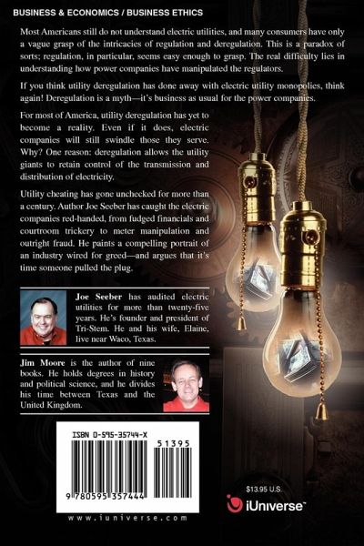 Most Americans still do not understand electric utilities, and many consumers have only a vague grasp of the intricacies of regulation and deregulation. This is a paradox of sorts; regulation, in particular, seems easy enough to grasp. The real difficulty lies in understanding how power companies have manipulated the regulators. If you think utility deregulation has done away with electric utility monopolies, think again! Deregulation is a myth-it's business as usual for the power companies. For most of America, utility deregulation has yet to become a reality. Even if it does, electric companies will still swindle those they serve. Why? One reason: deregulation allows the utility giants to retain control of the transmission and distribution of electricity. Utility cheating has gone unchecked for more than a century. Author Joe Seeber has caught the electric companies red-handed, from fudged financials and courtroom trickery to meter manipulation and outright fraud. He paints a compelling portrait of an industry wired for greed-and argues that it's time someone pulled the plug.