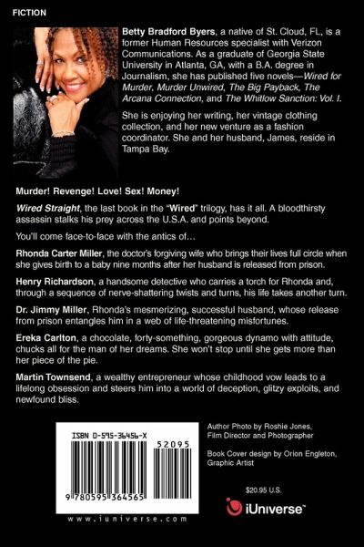 Murder! Revenge! Love! Sex! Money! Wired Straight, the last book in the 'Wired" trilogy, has it all. A bloodthirsty assassin stalks his prey across the U.S.A. and points beyond. You'll come face-to-face with the antics of. Rhonda Carter Miller, the doctor's forgiving wife who brings their lives full circle when she gives birth to a baby nine months after her husband is released from prison. Henry Richardson, a handsome detective who carries a torch for Rhonda and, through a sequence of nerve-shattering twists and turns, his life takes another turn. Dr. Jimmy Miller, Rhonda's mesmerizing, successful husband, whose release from prison entangles him in a web of life-threatening misfortunes. Ereka Carlton, a chocolate, forty-something, gorgeous dynamo with attitude, chucks all for the man of her dreams. She won't stop until she gets more than her piece of the pie. Martin Townsend, a wealthy entrepreneur whose childhood vow leads to a lifelong obsession and steers him into a world of deception, glitzy exploits, and newfound bliss.