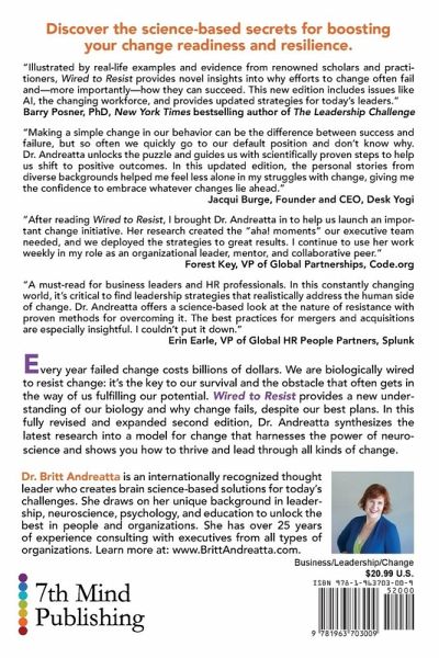 Every year failed change costs billions of dollars. We are biologically wired to resist change: it's the key to our survival and the obstacle that often gets in the way of us fulfilling our potential. Wired to Resist provides a new understanding of our biology and why change fails, despite our best plans. In this fully revised and expanded second edition, Dr. Andreatta synthesizes the latest research into a model for change that harnesses the power of neuroscience and shows you how to thrive and lead through all kinds of change. Whether you are on the leading or receiving end of change, you'll find useful tips and strategies you can implement today. The truth is that change affects us every day, both at work and at home, so I synthesize my research into practical takeaways to use anywhere they're needed. Knowing how we are wired to resist change and, more importantly, how to overcome that resistance to become more adaptive and resilient will serve you throughout your life. This new edition is born from consulting with global organizations on change. It includes several new chapters on the main drivers of changes and pressing issues challenging organizations of all sizes, including technology and artificial intelligence (AI), the growing impact of change fatigue and burnout, the environment and climate change, and shifting workforce demographics pushing organizations to become more purpose-driven. It also includes a greatly expanded section for senior leaders with updated strategies for these modern times. There is new chapter on mergers and acquisitions (M&As) after interviewing several executives who played a central role in some of the biggest deals of the past few years with Nestlé, Microsoft, Amazon, Starbucks, McDonnell Douglas Aerospace, T-Mobile, and Cisco. This 2nd edition is organized into seven sections: I. We'll begin by understanding what change looks like in today's organizations. II. Next, we'll dive into the brain science of change and why it drives fear, fatigue, and burnout. III. Then I'll introduce you to the new Change Quest model that synthesizes all the findings into an effective framework you can apply to changes of all kinds. IV. This section offers tips and strategies for employees to successfully navigate change as well as for managers who are responsible for leading others through change. V. Then we'll explore the four big drivers of change and how they impact organizations where you work, as well as others you engage with as a customer or community member. VI. This section focuses on several strategies and best practices for executives and senior leaders to prepare you factors that will drive change in your organization for years to come. VII. We'll end with some final thoughts on change, you'll synthesize your learning journeys, and I'll share my acknowledgments as well as the references for every study I mention. Throughout, you will find stories about change, first-person narratives from 20 individuals who represent a wide range of industries, as diverse as finance, manufacturing, hospitality, education, technology, and healthcare. Each person tells their own story of moving through a change journey, some of which were smooth and successful while others were filled with struggle.