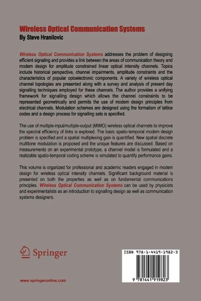 The use of optical free-space emissions to provide indoor wireless com- nications has been studied extensively since the pioneering work of Gfeller and Bapst in 1979 [1]. These studies have been invariably interdisciplinary - volving such far flung areas such as optics design' indoor propagation studies' electronics design' communications systems design amongothers. The focus of this text is on the design of communications systems for indoor wireless optical channels. Signalling techniques developed for wired fibre optic n- works are seldom efficient since they do not consider the bandwidth restricted nature of the wireless optical channel. Additionally' the elegant design meth- ologies developed for electrical channels are not directly applicable due to the amplitude constraints of the optical intensity channel. This text is devoted to presenting optical intensity signalling techniques which are spectrally efficient' i. e. ' techniques which exploit careful pulse design or spatial degrees of freedom to improve data rates on wireless optical channels. The material presented here is complementary to both the comprehensive work of Barry [2] and to the later book by Otte et al. [3] which focused prim- ily on the design of the optical and electronic sub-systems for indoor wireless optical links. The signalling studies performed in these works focused p- marily on the analysis of popular signalling techniques for optical intensity channels and on the use of conventional electrical modulation techniques with some minor modifications (e. g. ' the addition of a bias).
