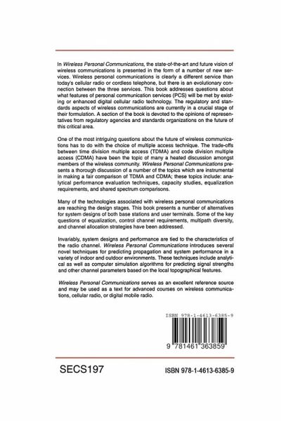 Many of the technologies associated with wireless personal communications are reaching the design stages. This book presents a number of alternatives for designs of both base stations and user terminals. Some of the key questions of equalization, control channel requirements, multi-path diversity and channel allocation strategies have been addressed. Invariably, system designs and performance are tied to the characteristics of the radio channel. This book introduces several novel techniques for predicting propagation and system performance in a variety of indoor and outdoor environments. These techniques include analytical as well as computer simulation algorithms for predicting signal strenghts and other channel parameters based on the local topographical features.