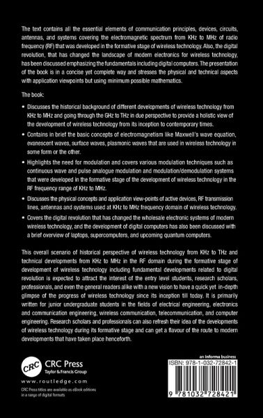 The text contains all the essential elements of communication principles, devices, circuits, antennas, and systems covering the electromagnetic spectrum from KHz to MHz of radio frequency (RF) that was developed in the formative stage of wireless technology.