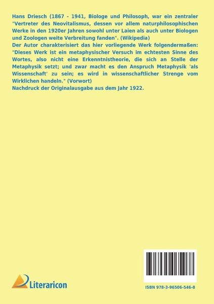 Hans Driesch (1867 - 1941, Biologe und Philosoph, war ein zentraler "Vertreter des Neovitalismus, dessen vor allem naturphilosophischen Werke in den 1920er Jahren sowohl unter Laien als auch unter Biologen und Zoologen weite Verbreitung fanden". (Wikipedia) Der Autor charakterisiert das hier vorliegende Werk folgendermaßen: "Dieses Werk ist ein metaphysischer Versuch im echtesten Sinne des Wortes, also nicht eine Erkenntnistheorie, die sich an Stelle der Metaphysik setzt; und zwar macht es den Anspruch Metaphysik 'als Wissenschaft' zu sein; es wird in wissenschaftlicher Strenge vom Wirklichen handeln." (Vorwort) Nachdruck der Originalausgabe aus dem Jahr 1922.