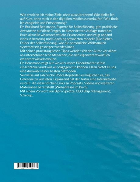 Wie erreiche ich meine Ziele, ohne auszubrennen? Wie bleibe ich auf Kurs, ohne mich in den digitalen Medien zu verlaufen? Wie finde ich Ausgleich und Entspannung?Dr. Burkhard Bensmann, Experte für Selbstführung, gibt praktische Antworten auf diese Fragen. In dieser dritten und erweiterten Auflage nutzt das Buch aktuelle wissenschaftliche Erkenntnisse und zeigt anhand eines in Beratung und Coaching bewährten Modells (Die Sieben Felder der Selbstführung), wie die persönliche Wirksamkeit systematisch gesteigert werden kann.Mit seinen praxistauglichen Tipps wendet sich der Autor vor allem an unternehmerische Menschen, die sich eigenverantwortlich weiterentwickeln wollen.Dr. Bensmann zeigt auf, wo wir unsere Produktivität selbst einschränken und was wir dagegen tun können. Dazu bietet er uns eine Auswahl seiner besten Methoden zur Steuerung der eigenen Person.Verweise auf zahlreiche Podcastepisoden ermöglichen es, das Gelesene zu vertiefen. Ergänzend hat der Autor eine Internetseite erstellt, die wesentlichen Links zu Podcasts, Videos und weiteren Materialien bereitstellt (Webadresse im Buch).Mit einem Vorwort von Björn Sprotte, CEO Ship Management, V.Group.