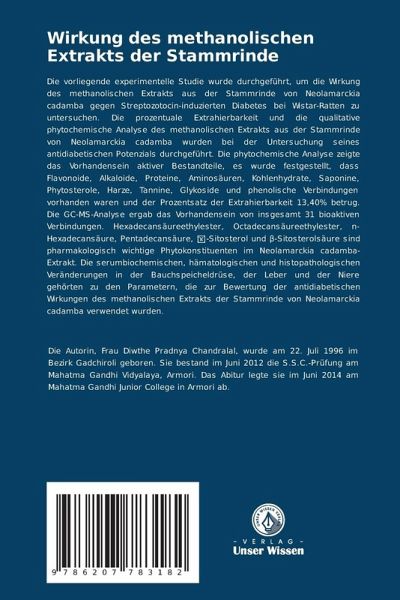 Die vorliegende experimentelle Studie wurde durchgeführt, um die Wirkung des methanolischen Extrakts aus der Stammrinde von Neolamarckia cadamba gegen Streptozotocin-induzierten Diabetes bei Wistar-Ratten zu untersuchen. Die prozentuale Extrahierbarkeit und die qualitative phytochemische Analyse des methanolischen Extrakts aus der Stammrinde von Neolamarckia cadamba wurden bei der Untersuchung seines antidiabetischen Potenzials durchgeführt. Die phytochemische Analyse zeigte das Vorhandensein aktiver Bestandteile, es wurde festgestellt, dass Flavonoide, Alkaloide, Proteine, Aminosäuren, Kohlenhydrate, Saponine, Phytosterole, Harze, Tannine, Glykoside und phenolische Verbindungen vorhanden waren und der Prozentsatz der Extrahierbarkeit 13,40% betrug. Die GC-MS-Analyse ergab das Vorhandensein von insgesamt 31 bioaktiven Verbindungen. Hexadecansäureethylester, Octadecansäureethylester, n-Hexadecansäure, Pentadecansäure, -Sitosterol und beta-Sitosterolsäure sind pharmakologisch wichtige Phytokonstituenten im Neolamarckia cadamba-Extrakt. Die serumbiochemischen, hämatologischen und histopathologischen Veränderungen in der Bauchspeicheldrüse, der Leber und der Niere gehörten zu den Parametern, die zur Bewertung der antidiabetischen Wirkungen des methanolischen Extrakts der Stammrinde von Neolamarckia cadamba verwendet wurden.