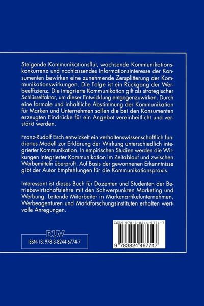 A. Einführung in die Problemstellung.- 1. Integrierte Kommunikation als praktische und theoretische Herausforderung.- 2. Zielsetzung und Aufbau der Arbeit.- B. Theoretischer Teil.- I. Wissenschaftliche Einordnung der "integrierten Kommunikation".- II. Verhaltenswissenschaftliche Ansätze zur Erklärung von Wirkungen auf integrierte Kommunikation.- III. Empirische Erkenntnisse zur Wirkung koordinierter Werbung.- IV. Folgerungen: ein Modell der integrierten Kommunikation.- C. Empirischer Teil: Untersuchungen zur integrierten Kommunikation.- I. Explorative Studie zur integrierten Kommunikation: Inhaltsanalyse zur Überprüfung des Integrationsstandes der Werbung in der Praxis.- II. Kausalanalytische Studien zur Messung der Wirkung integrierter Kommunikation.- III. Folgerungen für die integrierte Kommunikation.- D. Perspektiven für die Umsetzung der integrierten Kommunikation im Marketing.- Anlagen.