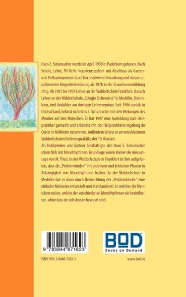 Hans E. Schumacher wurde im April 1938 in Paderborn geboren. Nach Schule, Lehre, FH-Reife Ingenieurstudium mit Abschluss als Garten- und Tiefbauingenieur. Grad. Nach schwerer Erkrankung und daraus resultierender Körperbehinderung ab 1978 in der Erwachsenenbildung tätig. Ab 1983 bis 1993 Lehrer an der Waldorfschule Frankfurt. Danach Lehrer an der Waldorfschule "Colegio Etchevarria" in Medellin, Kolumbien, und Ausbilder am dortigen Lehrerseminar. Seit 1996 zurück in Deutschland, befasst sich Hans E. Schumacher mit den Wirkungen des Mondes auf den Menschen. Er hat 1997 eine Ausbildung zum Heilpraktiker gemacht und arbeitete mit der Heilpraktikerin Ingeborg de Coster in Kelkheim zusammen. Außerdem leitete er an verschiedenen Waldorfschulen Feldmesspraktika der 10. Klassen.Als Hobbyimker und Gärtner beschäftigte sich Hans E. Schumacher schon früh mit Mondrhythmen. Grundlage waren immer die Aussaattage von M. Thun. In der Waldorfschule in Frankfurt ist ihm aufgefallen, dass die "Problemkinder" ihre positiven und kritischen Phasen in Abhängigkeit von Mondrhythmen hatten. An der Waldorfschule in Medellin hat er dann durch Beobachtung der "Problemkinder" eine einfache Malweise entwickelt und standardisiert, in welcher die Menschen malen, welche der verschiedenen Mondrhythmen sie beeinflussen, ohne dass sie sich dessen bewusst sind.