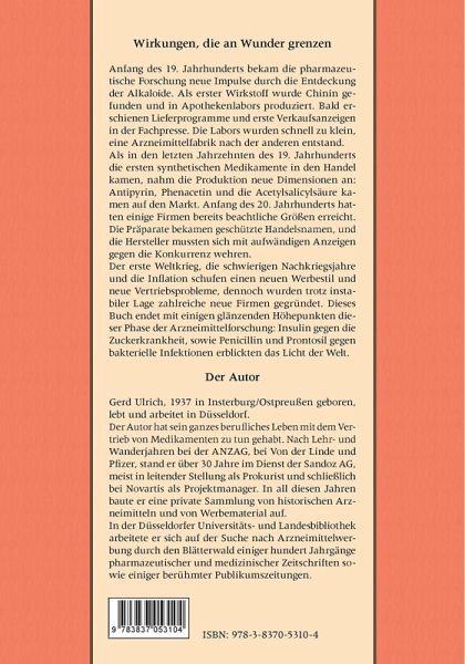 Gerd Ulrich, 1937 in Insterburg/Ostpreußen geboren, lebt und arbeitet in Düsseldorf. Der Autor hat sein ganzes berufliches Leben mit dem Vertrieb von Medikamenten zu tun gehabt. Nach Lehr- und Wanderjahren bei der ANZAG, bei Von der Linde und Pfizer, stand er über 30 Jahre in leitender Stellung im Dienst der Sandoz AG, und der Novartis Pharma. In der Düsseldorfer Universitäts- und Landesbibliothek durchforstete er für sein Buch über Arzneimittelwerbung den Blätterwald einiger hundert Jahrgänge Pharmazeutischer und Medizinischer Zeitschriften sowie berühmter Publikumszeitungen. Neben Publikationen über Pharmawerbung in Fachzeitschriften hat der Autor, inspiriert von seinen zwei Söhnen, noch das Kinderbuch "Tom und der Roboter" geschrieben.