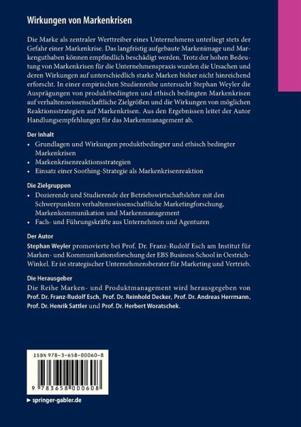 Die Marke als zentraler Werttreiber eines Unternehmens unterliegt stets der Gefahr einer Markenkrise. Das langfristig aufgebaute Markenimage und Markenguthaben können empfindlich beschädigt werden. Trotz der hohen Bedeutung von Markenkrisen für die Unternehmenspraxis wurden die Ursachen und deren Wirkungen auf unterschiedlich starke Marken bisher nicht hinreichend erforscht. In einer empirischen Studienreihe untersucht Stephan Weyler die Ausprägungen von produktbedingten und ethisch bedingten Markenkrisen auf verhaltenswissenschaftliche Zielgrößen und die Wirkungen von möglichen Reaktionsstrategien auf Markenkrisen. Aus den Ergebnissen leitet der Autor Handlungsempfehlungen für das Markenmanagement ab.