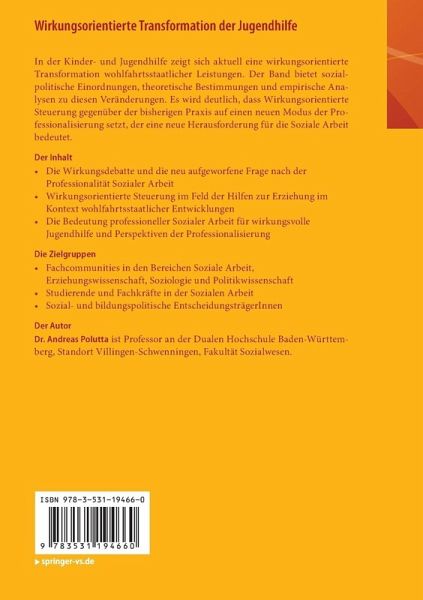 Rekonstruktion: Die Wirkungsdebatte und die neu aufgeworfene Frage nach der Professionalität Sozialer Arbeit.- Analyse: Wirkungsorientierte Steuerung im Feld der Hilfen zur Erziehung und die Rolle der Profession Sozialer Arbeit.- Konklusion: Die Bedeutung professioneller Sozialer Arbeit für wirkungsvolle Jugendhilfe und Perspektiven der Professionalisierung.