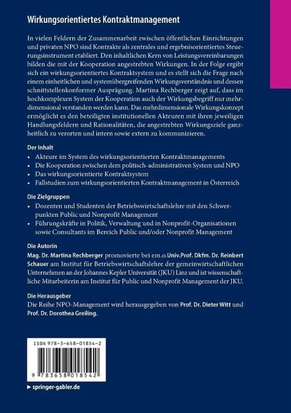 In vielen Feldern der Zusammenarbeit zwischen öffentlichen Einrichtungen und privaten NPO sind Kontrakte als zentrales und ergebnisorientiertes Steuerungsinstrument etabliert. Den inhaltlichen Kern von Leistungsvereinbarungen bilden die mit der Kooperation angestrebten Wirkungen. In der Folge ergibt sich ein wirkungsorientiertes Kontraktsystem und es stellt sich die Frage nach einem einheitlichen und systemübergreifenden Wirkungsverständnis und dessen Schnittstellenkonforme Ausprägung. Martina Rechberger zweigt auf, dass im hochkomplexen System der Kooperation auch der Wirkungsbegriff nur mehrdimensional verstanden werden kann. Das mehrdimensionale Wirkungskonzept ermöglicht es den beteiligten institutionellen Akteuren mit ihren jeweiligen Handlungsfeldern und Rationalitäten die angestrebten Wirkungsziele ganzheitlich zu verorten und intern sowie extern zu kommunizieren.