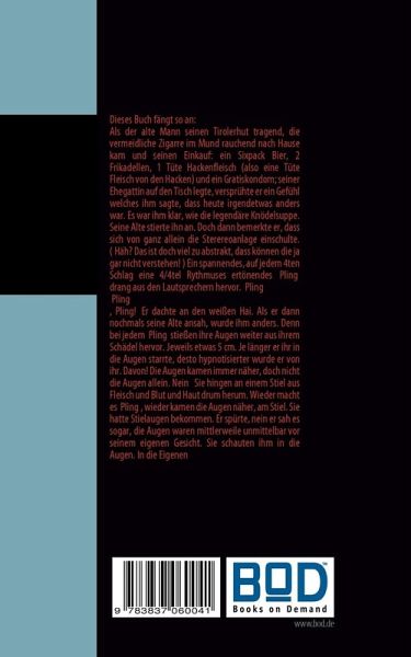 Dieses Buch fängt so an:Als der alte Mann seinen Tirolerhut tragend, die vermeidliche Zigarre im Mund rauchend nach Hause kam und seinen Einkauf: ein Sixpack Bier, 2 Frikadellen, 1 Tüte Hackenfleisch (also eine Tüte Fleisch von den Hacken) und ein Gratiskondom; seiner Ehegattin auf den Tisch legte, versprühte er ein Gefühl welches ihm sagte, dass heute irgendetwas anders war. Es war ihm klar, wie die legendäre Knödelsuppe. Seine Alte stierte ihn an. Doch dann bemerkte er, dass sich von ganz allein die Sterereoanlage einschulte. ("Häh? Das ist doch viel zu abstrakt, dass können die ja gar nicht verstehen!") Ein spannendes, auf jedem 4ten Schlag eine 4/4tel Rythmuses ertönendes "Pling" drang aus den Lautsprechern hervor. "Pling... Pling..., Pling!" Er dachte an den weißen Hai. Als er dann nochmals seine Alte ansah, wurde ihm anders. Denn bei jedem "Pling" stießen ihre Augen weiter aus ihrem Schädel hervor. Jeweils etwas 5 cm. Je länger er ihr in die Augen starrte, desto hypnotisierter wurde er von ihr. Davon! Die Augen kamen immer näher, doch nicht die Augen allein. Nein - Sie hingen an einem Stiel aus Fleisch und Blut und Haut drum herum. Wieder macht es "Pling", wieder kamen die Augen näher, am Stiel. Sie hatte Stielaugen bekommen. Er spürte, nein er sah es sogar, die Augen waren mittlerweile unmittelbar vor seinem eigenen Gesicht. Sie schauten ihm in die Augen. In die Eigenen