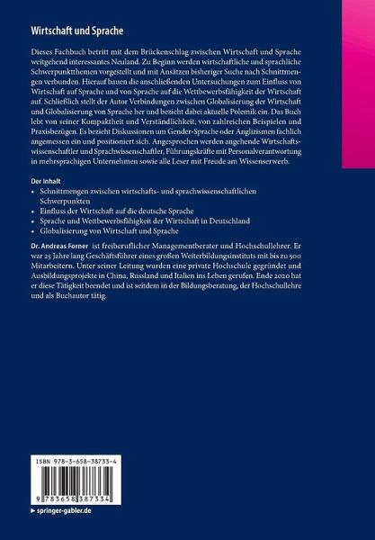 Dieses Fachbuch betritt mit dem Brückenschlag zwischen Wirtschaft und Sprache weitgehend interessantes Neuland. Zu Beginn werden wirtschaftliche und sprachliche Schwerpunktthemen vorgestellt und mit Ansätzen bisheriger Suche nach Schnittmengen verbunden. Hierauf bauen die anschließenden Untersuchungen zum Einfluss von Wirtschaft auf Sprache und von Sprache auf die Wettbewerbsfähigkeit der Wirtschaft auf. Schließlich stellt der Autor Verbindungen zwischen Globalisierung der Wirtschaft und Globalisierung von Sprache her und bezieht dabei aktuelle Polemik ein. Das Buch lebt von seiner Kompaktheit und Verständlichkeit, von zahlreichen Beispielen und Praxisbezügen. Es bezieht Diskussionen um Gender-Sprache oder Anglizismen fachlich angemessen ein und positioniert sich. Angesprochen werden angehende Wirtschaftswissenschaftler und Sprachwissenschaftler, Führungskräfte mit Personalverantwortung in mehrsprachigen Unternehmen sowie alle Leser mit Freude am Wissenserwerb.