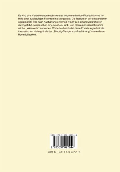 A. Einleitung.- 1. Anfall und Stand der Technik zur Verwertung hocheisenhaltiger Rohstoffe der Eisen- und Stahlindustrie.- 2. Ziel und Abgrenzung der Forschungsarbeit.- B. Theoretische Grundlagen zur "Niedrig-Temperatur-Verfestigung" von eisenhaltigen Entfallstoffen.- 1. Die Sinterung.- 2. Festkörperreaktionen.- C. Filtration und Pelletierung.- 1. Materialeigenschaften.- 2. Verbesserung der Materialagglomeration.- 3. Agglomerationsuntersuchungen.- D. Brennhärtung der Formlinge.- 1. Stand der Technik.- 2. Versuchsaufbau.- 3. Versuchsdurchführung.- 4. Versuchsergebnisse.- 5. Strukturuntersuchungen.- 6. Ergebnisse der Strukturuntersuchungen.- 7. Kurzdiskussion der Versuchsergebnisse.- E. Untersuchung der Reduzierbarkeit der Formlinge.- 1. Allgemeine Reduktionsbedingungen.- 2. Reduktion von Filterformlingen - Stand der Technik.- 3. Versuchsaufbau und Versuchsdurchführung.- 4. Ergebnisse der Reduktionsuntersuchungen.- F. Gesamtdiskussion der Ergebnisse.- 1. Diskussion der Ergebnisse der Herstellung der Grünpellets.- 2. Diskussion der Ergebnisse der Materialaushärtung.- 3. Diskussion der Reduktionsergebnisse.- G. Zusammenfassung.- H. Literaturverzeichnis.- I. Tabellen.- Diagramme.- Bilder.