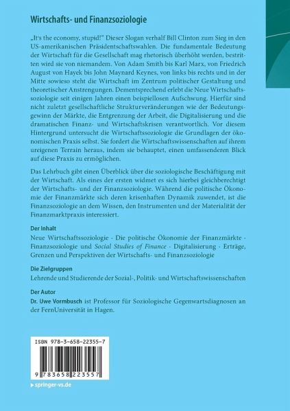Das Lehrbuch gibt einen Überblick über die soziologische Beschäftigung mit der Wirtschaft. Als eines der ersten widmet es sich hierbei gleichberechtigt der Wirtschafts- und der Finanzsoziologie. Während die politische Ökonomie der Finanzmärkte sich deren krisenhaften Dynamik zuwendet, ist die Finanzsoziologie an dem Wissen, den Instrumenten und der Materialität der Finanzmarktpraxis interessiert.
