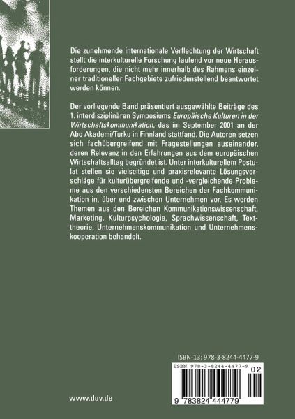 Der vorliegende Band präsentiert ausgewählte Beiträge des 1. interdisziplinären Symposiums Europäische Kulturen in der Wirtschaftskommunikation, das im September 2001 an der Åbo Akademi/Turku in Finnland stattfand. Die Autoren setzen sich fachübergreifend mit Fragestellungen auseinander, deren Relevanz in den Erfahrungen aus dem europäischen Wirtschaftsalltag begründet ist. Unter interkulturellem Postulat stellen sie vielseitige und praxisrelevante Lösungsvorschläge für kulturübergreifende und -vergleichende Probleme aus den verschiedensten Bereichen der Fachkommunikation in, über und zwischen Unternehmen vor. Es werden Themen aus den Bereichen Kommunikationswissenschaft, Marketing, Kulturpsychologie, Sprachwissenschaft, Texttheorie, Unternehmenskommunikation und Unternehmenskooperation behandelt.