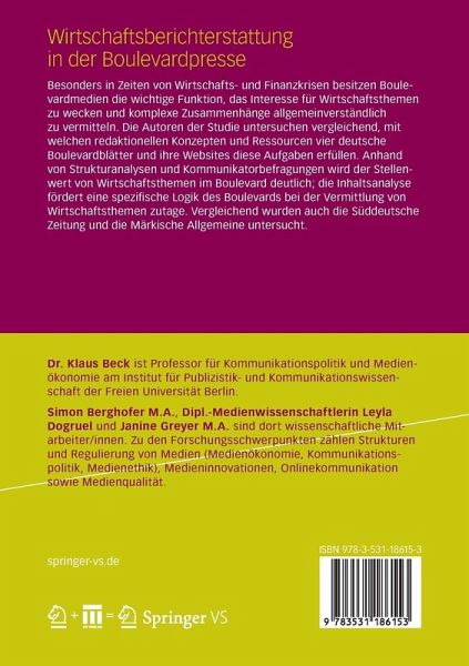 Besonders in Zeiten von Wirtschafts- und Finanzkrisen besitzen Boulevardmedien die wichtige Funktionen, das Interesse für Wirtschaftsthemen zu wecken und komplexe Zusammenhänge allgemeinverständlich zu vermitteln. Die Autoren der Studie untersuchen vergleichend, mit welchen redaktionellen Konzepten und Ressourcen vier deutsche Boulevardblätter und ihre Websites diese Aufgaben erfüllen. Anhand von Strukturanalysen und Kommunikatorbefragungen wird der Stellenwert von Wirtschaftsthemen im Boulevard deutlich; die Inhaltsanalyse fördert eine spezifische Logik des Boulevards bei der Vermittlung von Wirtschaftsthemen zutage. Vergleichend wurden auch die Süddeutsche Zeitung und die Märkische Allgemeine untersucht.