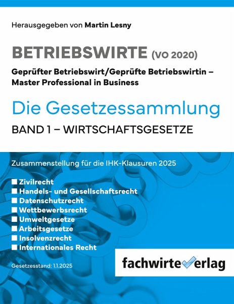 Bestmögliche Unterstützung für die IHK-Prüfung zum Betriebswirt Master Professional! Das ist der Zweck dieses Titels. Die Gesetzessammlung enthält die für die Prüfung benötigten wichtigsten Paragraphen und Gesetze aus dem Bürgerliches Gesetzbuch (BGB), Handels- und Gesellschaftsrecht (HGB, AktG, GmbHG, UmwG, SEEG, VO (EG) Nr. 2157/2001 SE), Datenschutzgesetze (BDSG, VO (EU) Nr. 2016/679 DS-GVO), Umweltgesetze (KrWG, VO (EG) Nr. 761/2001 EMAS, VerpackG), Arbeitsgesetze (ArbSchG, ASiG, JArbSchG, MuSchG, SGB IX, BetrVG, KSchG, AGG), Gesetze zum Wettbewerbsrecht (GWB, Vertikal-GVO, UWG,), Gesetze zu Gewerblichen Schutzrechten (PatG, GebrMG, MarkenG, DesignG), Insolvenzordnung (InsO), Produkthaftungsgesetz, Internationales Recht (AEUV, CISG).