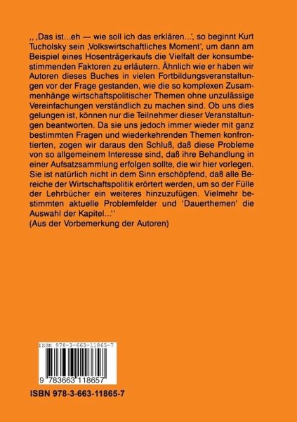 "Das ist . . . eh - wie soll ich das erklären . . . ", so beginnt Kurt Tucholsky sein "Volkswirtschaftliches Moment", um dann am Beispiel eines Hosenträger kaufs die Vielfalt der konsumbestimmenden Faktoren zu erläutern. Ähnlich wie er haben wir Autoren dieses Buches in vielen Fortbildungsveranstaltun gen vor der Frage gestanden, wie die ach so komplexen Zusammenhänge wirtschaftspolitischer Themen ohne unzulässige Vereinfachungen ver ständlich zu machen sind. Ob uns dies gelungen ist, können nur die Teilneh mer dieser Veranstaltungen beantworten. Da sie uns jedoch immer wieder mit ganz bestimmten Fragen und wiederkehrenden Themen konfrontierten, zogen wir daraus den Schluß, daß diese Probleme von so allgemeinem In teresse sind, daß ihre Behandlung in einer Aufsatzsammlung erfolgen sollte, die wir hier vorlegen. Sie ist natürlich nicht in dem Sinne erschöp fend, daß alle Bereiche der Wirtschaftspolitik erörtert werden, um so der Fülle der Lehrbücher ein weiteres hinzuzufügen. Vielmehr bestimmten aktu elle Problemfelder und "Dauerthemen" die Auswahl der Kapitel. Kurz, lesbar und verständlich sollten sie sein und doch so konzipiert, daß falsche Simplifizierungen vermieden würden; ein "magisches Mehreck" der Ziele, das Kompromisse erforderte. Wir hoffen, daß die "Konsumenten" un seres Buches Antwort auf ihre Fragen finden und Anregungen zur weiteren Beschäftigung mit den Themen erhalten, die auch für uns nicht endgültig geklärt sind. Sind es doch gerade die Kontroversen um den "richtigen" Weg aus den aktuellen Wachstums-, Umwelt-, Struktur- und Währungskrisen, die zunächst einmal nachvollzogen werden müssen, um das eigene Urteil zu ermöglichen.