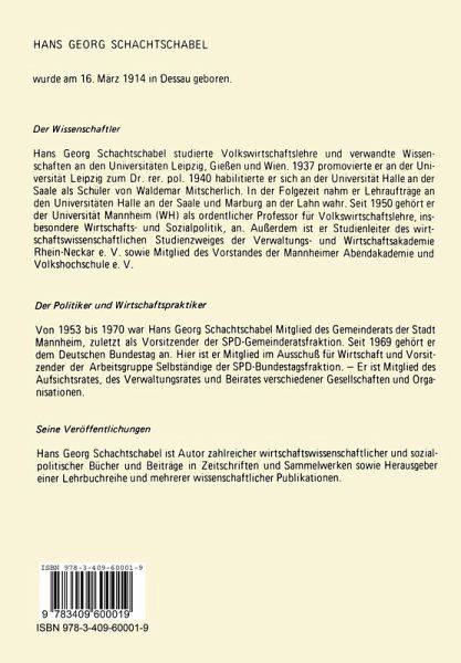 1 Schachtschabel, H. G.: Wirtschaftspolitische Konzeptionen, 3. Aufl., Stuttgart-Berlin-Koln Mainz 1976; Schachtschabel, H. G.: Allgemeine Wirtschaftspolitik, Stuttgart-Berlin-Koln Mainz 1975; Schachtschabel, H. G.: Ein System der Wirtschaftslehre. Ein Beitrag zur Frage nach der Wirtschaftslehre in der gestalteten und geordneten Wirtschaft, Halle 19{0; Schacht schabel, H. G.: Wirtschaftspolitische Konzeptionen, in: Handworterbuch der Volkswirtschafts lehre, hrsg. von Glastetter, W., Mandie, E. u. a., Wiesbaden 1978, Sp. 1633-1657; Schacht schabel, H. G .. Historischc Grundformen wirtschaftspolitischer Drdnungen, in: Marktwirtschaft in der gegenwartigen Auseinandersctzung, hrsg. von der Landeszentrale fiir politische Bildung in Nordrhein-Westfalen, Diisseldorf 1973, S. 20-35. 2 Zur Ziel-Mittel-Problematik in der Theorie der Wirtschaftspolitik vgl. u. a. Seraplmn, H.-j.: Theorie der Allgemeinen Volkswirtschaftspolitik, 2. Aufl., Gottingen 1963, insb. S. 233 ff. und S. 296 ff.; Schachtschabel, H. G.: Allgemeine Wirtschaftspolitik, a.a.D., insb. S. 72 ff. und S. 103 ff' 3 Schachtschabel, H. G.. Die sozialgeordnete Wirtschaft als Grundge~talt der Gegenwart, m. Methoden und Probleme der Wirtschaftspolitik, Gedachtnisschrift fur Hans-]iirgen Seraphim, hrsg. von Dhm, H., Berlin 1964, S. 65-85. 4 Ritschl, H.: Wirtschaftsordnung, in: Handworterbuch der Sozialwissenschaften, hrsg. von Beckerath, E. v., u. a., 12. Band, Stuttgart-Tiibingen-Gottingen 1965, S. 189. 5 Schachtschabel, H. G .. Allgememe Wirtschaftspolitik, a.a.D., S. 53. 6 Ebenda.