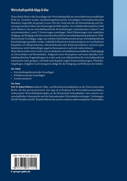 Dieses Buch führt in die Grundlagen der Wirtschaftspolitik aus wirtschaftswissenschaftlicher Sicht ein. Zunächst werden entscheidungstheoretische Grundlagen wirtschaftspolitischen Handelns vorgestellt, die gerade in einer Zeit des Umbruchs für die Herausbildung und Umsetzung innovativer Ideen eine herausragende Rolle spielen. Aus verhaltensökonomischer Sicht wird erläutert, warum wirtschaftspolitische Entscheidungen systematischen ("biases") und unsystematischen ("noise") Verzerrungen unterliegen. Nach Erläuterungen zum staatlichen Nudging und Sludging wird das innovationsfreundliche Serendipitätsprinzip präsentiert. Politökonomische Grundlagen zeigen, aus welchen Individualinteressen heraus wirtschaftspolitische Entscheidungen getroffen werden. Schließlich illustrieren Inzidenzanalysen an verschiedenen Beispielen wie Mietpreisbremse, Mindestlohnsatz oder Kohlendioxidsteuer, inwieweit gute Intentionen nicht-beabsichtigte negative Konsequenzen nach sich ziehen können.