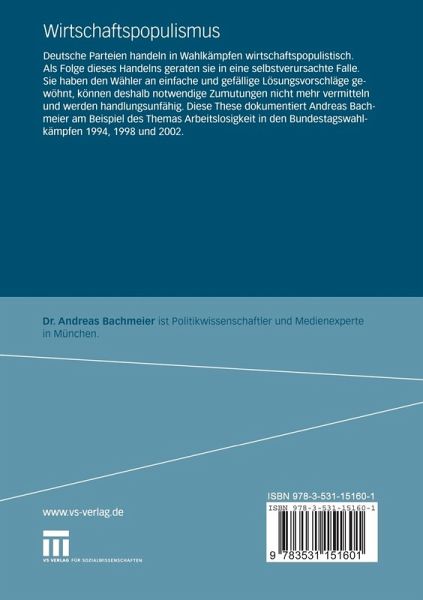 Deutsche Parteien handeln in Wahlkämpfen wirtschaftspopulistisch. Als Folge dieses Handelns geraten sie in eine selbstverursachte Falle. Sie haben den Wähler an einfache und gefällige Lösungsvorschläge gewöhnt, können deshalb notwendige Zumutungen nicht mehr vermitteln und werden handlungsunfähig. Diese These dokumentiert Andreas Bachmeier am Beispiel des Themas Arbeitslosigkeitin den Bundestagswahlkämpfen 1994, 1998 und 2002.