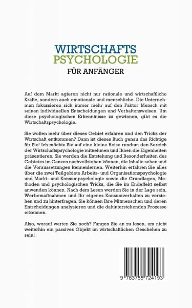 Auf dem Markt agieren nicht nur rationale und wirtschaftliche Kräfte, sondern auch emotionale und menschliche. Die Unternehmen fokussieren sich immer mehr auf den Faktor Mensch mit seinen individuellen Entscheidungen und Verhaltensweisen. Um diese psychologischen Erkenntnisse zu gewinnen, gibt es die Wirtschaftspsychologie.Sie wollen mehr über dieses Gebiet erfahren und den Tricks der Wirtschaft entkommen? Dann ist dieses Buch genau das Richtige für Sie! Ich möchte Sie auf eine kleine Reise rundum den Bereich der Wirtschaftspsychologie mitnehmen und Ihnen die Eigenheiten präsentieren. Sie werden die Entstehung und Besonderheiten des Gebietes im Ganzen nachvollziehen können, die Inhalte sehen und die Voraussetzungen kennenlernen. Weiterhin erfahren Sie alles über die zwei Teilgebiete Arbeits- und Organisationspsychologie und Markt- und Konsumpsychologie sowie die Grundlagen, Methoden und psychologischen Tricks, die Sie im Endeffekt selbst anwenden können. Nach dem Lesen werden Siein der Lage sein, Werbemaßnahmen und Ihr eigenes Konsumverhalten zu verstehen und zu hinterfragen. Sie können Ihre Mitmenschen und deren Entscheidungen analysieren und die dahinterstehenden Prozesse erkennen.Also, worauf warten Sie noch? Fangen Sie an zu lesen, um nicht weiterhin ein passives Objekt im wirtschaftlichen Geschehen zu sein!