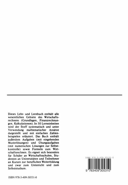 Wirtschaftsrechnen umfaBt verschiedene kaufmannische Rechnungen, die hier in Grund lagen, Finanzrechnungen und Kalkulationen unterschieden werden. Methodisch baut das Wirtschaftsrechnen weitgehend auf der Prozentrechnung und der Zinsrechnung auf, die Zinseszinsrechnung als Teil der Finanzmathematik soli nicht behandelt werden. 1m Kalku lationsbereich bedingt die Beschrankung auf kalkulatorische Fragestellungen den Verzicht auf eine weitergehende Betrachtung der Kostenrechnung. Zugunsten einer sachlichen und methodischen Straffung des Wirtschaftsrechnens werden unterschiedliche Ansatze und Details der Praxis zuriickgestellt. Bei der Konzeption dieses Buches wurden drei Gesichtspunkte beriicksichtigt: systematisches Darstellen des Wirtschaftsrechnens mit entsprechenden Dbungen, Verwendung mathematischer Ansatze, Moglichkeiten zur Selbstkontrolle. Die Inhalte des Wirtschaftsrechnens werden in 50 Lerneinheiten dargestellt, die dekadisch 9 Lerngebieten zugeordnet sind (Teile I, II undIII). Jede Lerneinheit besteht aus einem Lehrtext und einer Aufgabe. Die Lehrtexte enthalten jeweils die wirtschaftliche Fragestel lung, die Entwicklung und Erlauterung eines allgemeinen Losungsansatzes sowie ein oder mehrere Beispiele. In den Beispielen (B) werden moglichst einfache Zahlenwerte verwen det, urn damit die Losungswege auch numerisch zu veranschaulichen. Die Ergebnisse der Beispiele sind durch Fettdruck hervorgehoben; kursive Zahlen weisen darauf hin, daB von darunterstehenden Werten auszugehen ist bzw. zuvor Nebenrechnungen durchzufiihren sind. Die Aufgaben (A) enthalten jeweils drei Fragen mit multiple-choice-Vorgaben, in denen auch Ansatzfehler beriicksichtigt sind. Den Aufgaben sind eingehende MusterlOsun gen beigegeben. Die 100 Beispiele und 50 Aufgaben sind entsprechend den Lerneinheiten dekadisch numeriert. Die weiteren Obungsaufgaben sind gesondert zusammengefaBt, urn eine Geschlossen heit der Lerneinheiten zu erreichen (Teile IV und V).