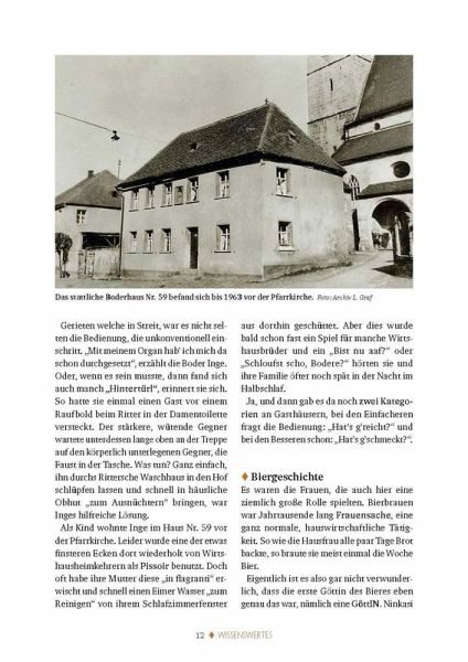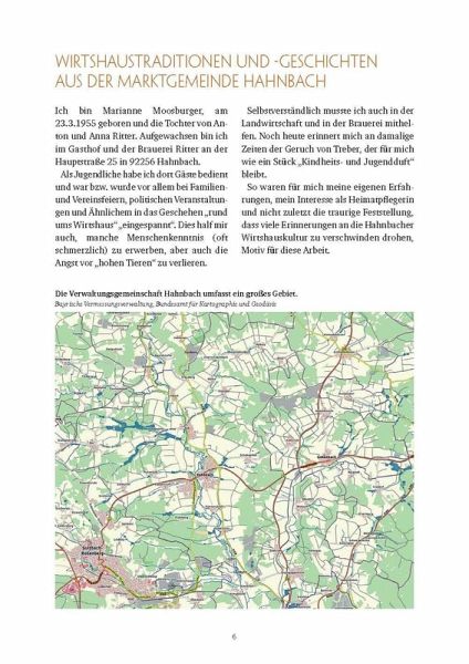 Marianne Moosburger (geb. 1955) ist die Tochter der Wirtsleute Anton und Anna Ritter. Sie ist im Gasthof und der Brauerei Ritter in der Hauptstraße 25 in Hahnbach aufgewachsen. Seit April 2019 ist sie Heimatpflegerin von Hahnbach. Jahrelang sammelte sie in der Marktgemeinde alte und neuere Wirtshausgeschichten sowie unzählige Fotos. Über 49 verschiedene Wirtschaften aus 23 Orten kann man nun in Orts- und Wirtshausgeschichten und vielen humorigen Anekdoten nachlesen. Zudem informieren zahlreiche Artikel über Wissenswertes und auch viel Unbekanntes "rund ums Bier". Man taucht ein ins Wirtshausleben von früher und liest Interessantes übers Brauen in Hahnbach und der Oberpfalz. Auch die Bierprüfer, eine Wirtshausordnung, Raufereien, Eisweiher, Bierkeller und vieles mehr sind im Buch zu finden. Entdecken Sie hier manches schon (fast) Vergessene, Witzige, Informative, aber auch durchaus Skurrile aus der Wirthauskultur "rundumadum" Hahnbach!