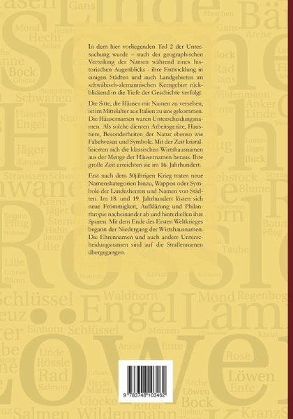 In dem hier vorliegenden Teil 2 der Untersuchung wurde - nach der geographischen Verteilung der Namen während eines historischen Augenblicks - ihre Entwicklung in einigen Städten und auch Landgebieten im schwäbisch-alemannischen Kerngebiet rückblickend in die Tiefe der Geschichte verfolgt.Die Sitte, die Häuser mit Namen zu versehen, ist im Mittelalter aus Italien zu uns gekommen. Die Häusernamen waren Unterscheidungsnamen. Als solche dienten Arbeitsgeräte, Haustiere, Besonderheiten der Natur ebenso wie Fabelwesen und Symbole. Mit der Zeit kristallisierten sich die klassischen Wirtshausnamen aus der Menge der Häusernamen heraus. Ihre große Zeit erreichten sie im 16. Jahrhundert. Erst nach dem 30jährigen Krieg traten neue Namenskategorien hinzu, Wappen oder Symbole der Landesherren und Namen von Städten. Im 18. und 19. Jahrhundert lösten sich neue Frömmigkeit, Aufklärung und Philanthropie nacheinander ab und hinterließen ihre Spuren. Mit dem Ende des Ersten Weltkrieges begann der Niedergang der Wirtshausnamen. Die Ehrennamen und auch andere Unterscheidungsnamen sind auf die Straßennamen übergegangen.