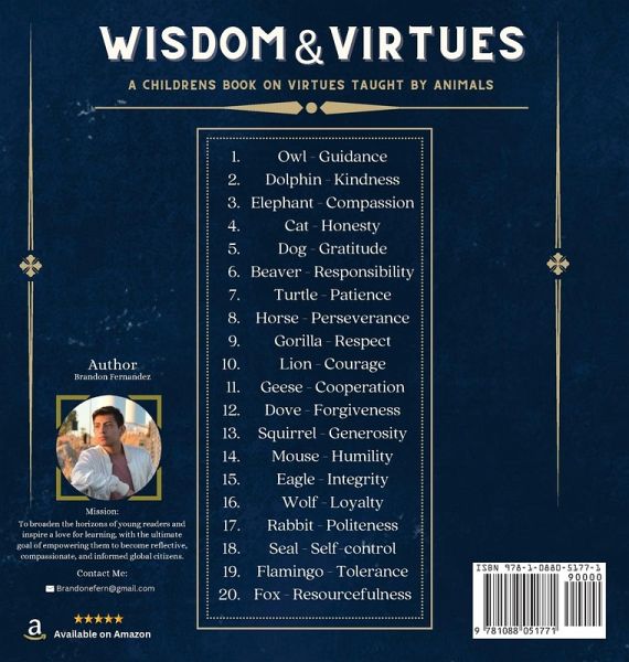 "Wisdom & Virtues" is a delightful children's book that introduces young readers to the concept of virtues through the stories of 20 fascinating animals. Each animal character embodies a specific virtue, such as courage, kindness, honesty, and patience, and demonstrates how to practice that virtue in their everyday life. Through these charming and engaging stories, children will learn valuable lessons about the importance of good character and the positive impact it can have on themselves and others. The colorful illustrations and easy-to-read text make this book an ideal choice for parents and teachers looking to instill important values in children.