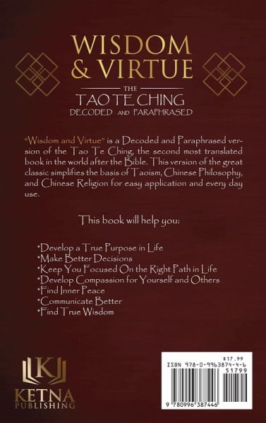 Wisdom and Virtue is a Decoded and Paraphrased version of the Tao Te Ching, th second most translated book in the world after the Bible. This version of the great classic simplifies the basis of Taoism, Chinese Philsophy, and Chinese Religion for easy application and every day use. This Book will Help you: Develop a True Purpose in Life, Make Better Decisions, Keep you focused on the Right Path in life, Develop compassion for yourself and others, find inner peace, communicate better, and find True Wisdom.