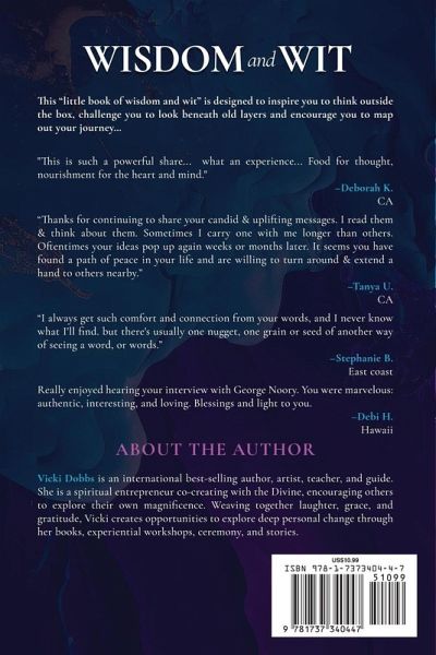 This "little book of wisdom and wit" is designed to inspire you to think outside the box,challenge you to look beneath old layers and encourage you to map out your journey... ¿Wisdom and Wit is a fun little book of information, inspiration, affirmations, and journaling opportunities to enhance your spiritual journey. "This is such a powerful share... what an experience... Food for thought, nourishment for the heart and mind." -Deborah K.CA "Thanks for continuing to share your candid & uplifting messages. I read them & think about them. Sometimes I carry one with me longer than others. Oftentimes your ideas pop up again weeks or months later. It seems you have found a path of peace in your life and are willing to turn around & extend a hand to others nearby."-Tanya U.CA "I always get such comfort and connection from your words, and I never know what I'll find. but there's usually one nugget, one grain or seed of another way of seeing a word, or words."-Stephanie B.East coast Really enjoyed hearing your interview with George Noory. You were marvelous: authentic, interesting, and loving. Blessings and light to you. -Debi H.Hawaii