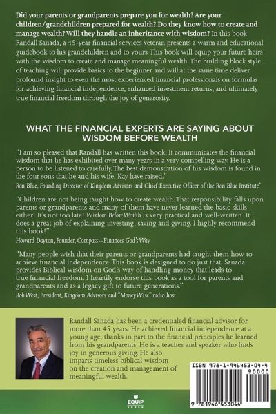 Did your parents or grandparents prepare you for wealth? Are your children/grandchildren prepared for wealth? Do they know how to create and manage wealth? Will they handle an inheritance with wisdom? In this book Randall Sanada, a 45 year financial services veteran presents a warm and educational guidebook to his grandchildren and to yours. This book will equip your future heirs with the wisdom to create and manage meaningful wealth.The building block style of teaching will provide basics to the beginner and will at the same time deliver profound insight to even the most experienced financial professionals on formulas for achieving financial independence, enhanced investment returns, and ultimately true financial freedom through the joy of generosity.