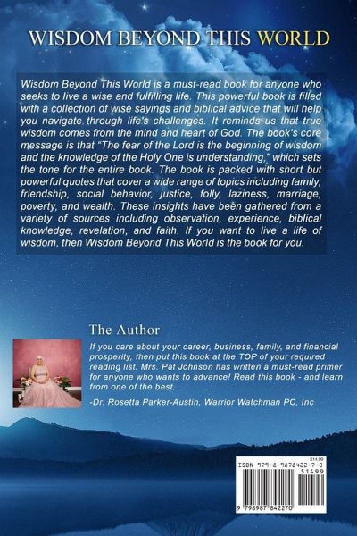 Wisdom Beyond This World is a must-read book for anyone who seeks to live a wise and fulfilling life. This powerful book is filled with a collection of wise sayings and biblical advice that will help you navigate through life's challenges. It reminds us that true wisdom comes from the mind and heart of God. The book's core message is that "The fear of the Lord is the beginning of wisdom and the knowledge of the Holy One is understanding," which sets the tone for the entire book. The book is packed with short but powerful quotes that cover a wide range of topics, including family, friendship, social behavior, justice, folly, laziness, marriage, poverty, and wealth. These insights have been gathered from a variety of sources, including observation, experience, biblical knowledge, revelation, and faith. If you want to live a life of wisdom, then Wisdom Beyond This World is the book for you.