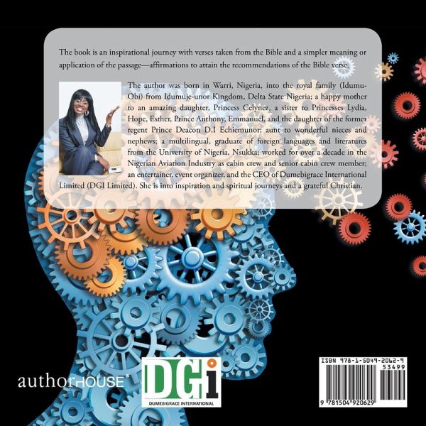 The author was born in Warri, Nigeria, into the royal family (Idumu-Obi) from Idumuje-unor Kingdom, Delta State Nigeria; a happy mother to an amazing daughter, Princess Celynez, a sister to Princesses Lydia, Hope, Esther, Prince Anthony, Emmanuel, and the daughter of the former regent Prince Deacon D.I Echiemunor; aunt to wonderful nieces and nephews; a multilingual, graduate of foreign languages and literatures from the University of Nigeria, Nsukka; worked for over a decade in the Nigerian Aviation Industry as cabin crew and senior cabin crew member; an entertainer, event organizer, and the CEO of Dumebigrace International Limited (DGI Limited). She is into inspiration and spiritual journeys and a grateful Christian.