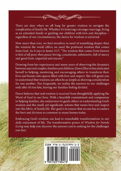 There are days when we all long for greater wisdom to navigate the complexities of family life. Whether it's fostering a stronger marriage, living as an extended family or guiding our children with love and discipline - regardless of our circumstances, the desire for wisdom is universal. Now more than ever, we find ourselves in need of something deeper than the wisdom the world offers; we need the profound wisdom that comes from God. As it says in James 3:17, "The wisdom that comes from heaven is first of all pure; then peace-loving, considerate, submissive, full of mercy and good fruit, impartial and sincere." Drawing from her experiences and many years of observing the dynamics between married couples, families and children, Dawn J Barrie has dedicated herself to helping, mentoring and encouraging others to transform their lives and homes into spaces filled with love and respect. She will guide you to understand that wisdom can often be as simple as showing consideration for one another. Too frequently, we realize the answers to our challenges only after it's too late, leaving our families feeling divided. Dawn believes that real wisdom is received from thoughtfully applying the Word of God to our lives. With a heartfelt commitment and compassion to helping families, she endeavours to guide others in understanding God's wisdom and the small, yet significant, actions that weave love and respect into the fabric of family life. Her goal is to ensure that no one has to endure the hurt and division so common in many homes today. Embracing God's wisdom can lead to remarkable transformations in our daily enjoyment of life. The transformative power of Wisdom for Family Living may help you discover the answers you're seeking for the challenges you face.