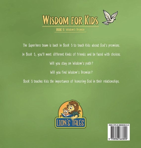 King Solomon's Marvelous Life Guide and the Importance of Wisdom Have you ever met a SUPERHERO??? What if you could talk to a superhero anytime you wanted? The Superheroes of Proverbs are available anytime you need them! In Book Five, you'll meet friends and face choices - choose God's promise or follow the Wrong Way. Join the Superheroes of Proverbs: Captain Wisdom, Knowledge the Liberator, Ranger Goodsense, and Understanding the Insightful Guardian... ...as they discover God's promises. Book Five offers kids special insight in learning to make good choices even when no one is watching. Captain Wisdom and her team teach important lessons to kids and asks them to follow God on the Way of Wisdom. Book Five of the Wisdom for Kids series draws on the timeless wisdom of Solomon's sayings to remind kids of all ages who God made them to be and how to live their lives with Him on a day-to-day basis. The lessons found in Book Five are enduring and are the key to understanding what it looks like to live a smart and intentionally good life.