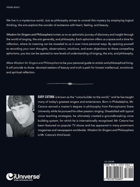 We live in a mysterious world. Just as philosophy strives to unravel this mystery by employing logical thinking, the arts explore the wonder of existence with heart, feeling, and beauty. Wisdom for Singers and Philosophers invites us on an aphoristic journey of discovery and insight through the world of singing, the arts generally, and philosophy. Each aphorism offers us a space and a time for reflection, where its meaning can be revealed to us in ever more personal ways. By opening yourself to recording your own thoughts, observations, intuitions, and even objections to these compelling aphorisms, you too can be opened to new levels of understanding of singing, the arts, and philosophy. Allow Wisdom for Singers and Philosophers to be your personal guide to artistic and philosophical living. It will provide to those devoted seekers of beauty and truth a path for honest intellectual, emotional, and spiritual reflection.