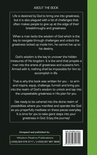 Life is destined by God to bring one into greatness, but it is also plagued with a lot of challenges that often makes people to give up at the edge of their breakthroughs and greatness. When a man lacks the wisdom of God which is the key to navigate through challenges and to unlock the greatness locked up inside him, he cannot live up to his destiny. God's wisdom is the key to uncover the hidden treasures of His kingdom. It is the wind that propels a man into the arena of greatness and sustains him. Armed with it, nothing shall be impossible for him to accomplish in life. That is why this book was written for you - to arm and inspire, equip, challenge, furnish and bring you into the realm of God's wisdom to unlock and tap into the unspeakable greatness in His plan for you.