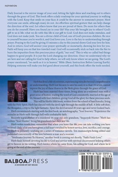Daily Journal is the mirror image of your soul, letting the light shine and reaching out to others through the grace of God. This book offers a daily roadmap for your spiritual journey in walking with the Lord. Keep that smile on your face; it could be the answer to someone's prayer. Most everyone can smile, although many do not. An effortless spiritual gesture that can help change the direction of the soul. Let others know that you are proud of them. Do more for others than you do for yourself. Have you found joy in your life? Has your life brought joy to others? God's gift to us is life; what we do with this life is our gift to God. God does not make mistakes, and God does not make junk. You are a divine child of God, one of God's precious children. Be nice to yourself because you're worth it, and God loves you. Love is the key to understanding through prayer. Praying to the Lord by giving 15 minutes a day to this journal shows God your love for him. And in return, God will answer your prayer spiritually or monetarily, showing his love for you. Faith will keep you on that less traveled road. God will occasionally stick us back into the fire to burn the impurities from this precious piece of gold, "our soul." This is why so-called bad things happen to good people. It is just the Lord changing our direction. Once we understand why we are here and our calling for God to help others, we will only know where we are going. The Lord's prayer mentioned, "on earth as it is in heaven." Bible (Basic Instruction Before Leaving Earth). Helping someone will make you feel good about yourself, and this book offers the tools needed.